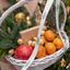 В составе набора свежие фрукты, шоколадные конфеты и ёлочные веточки, украшенные игрушками